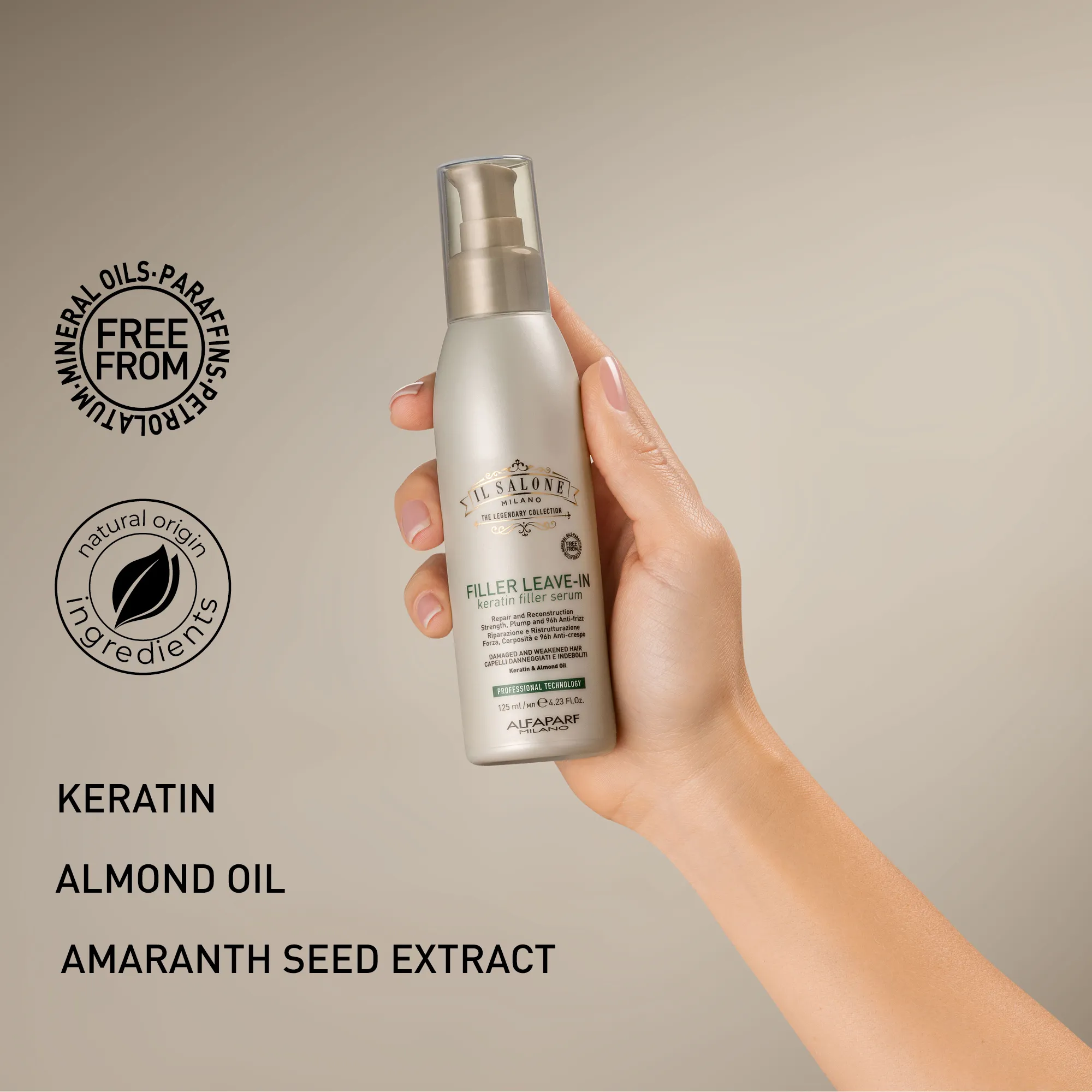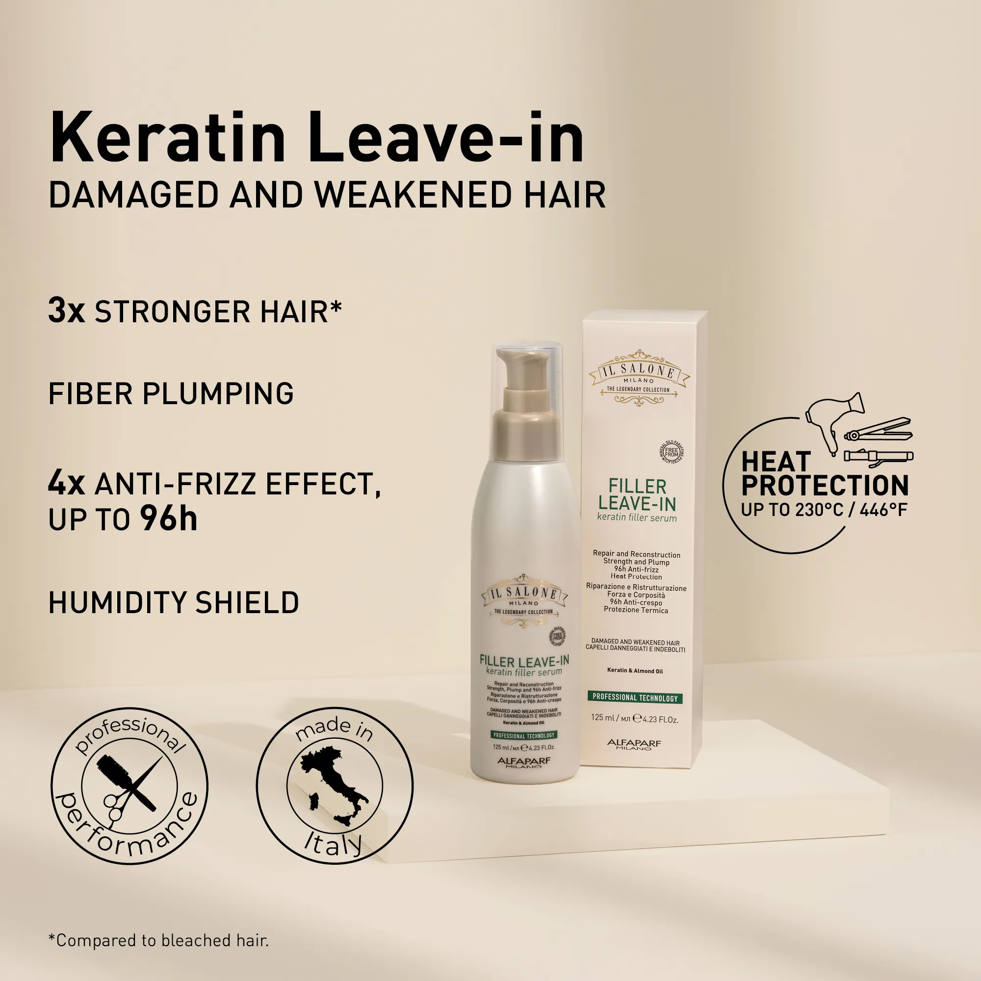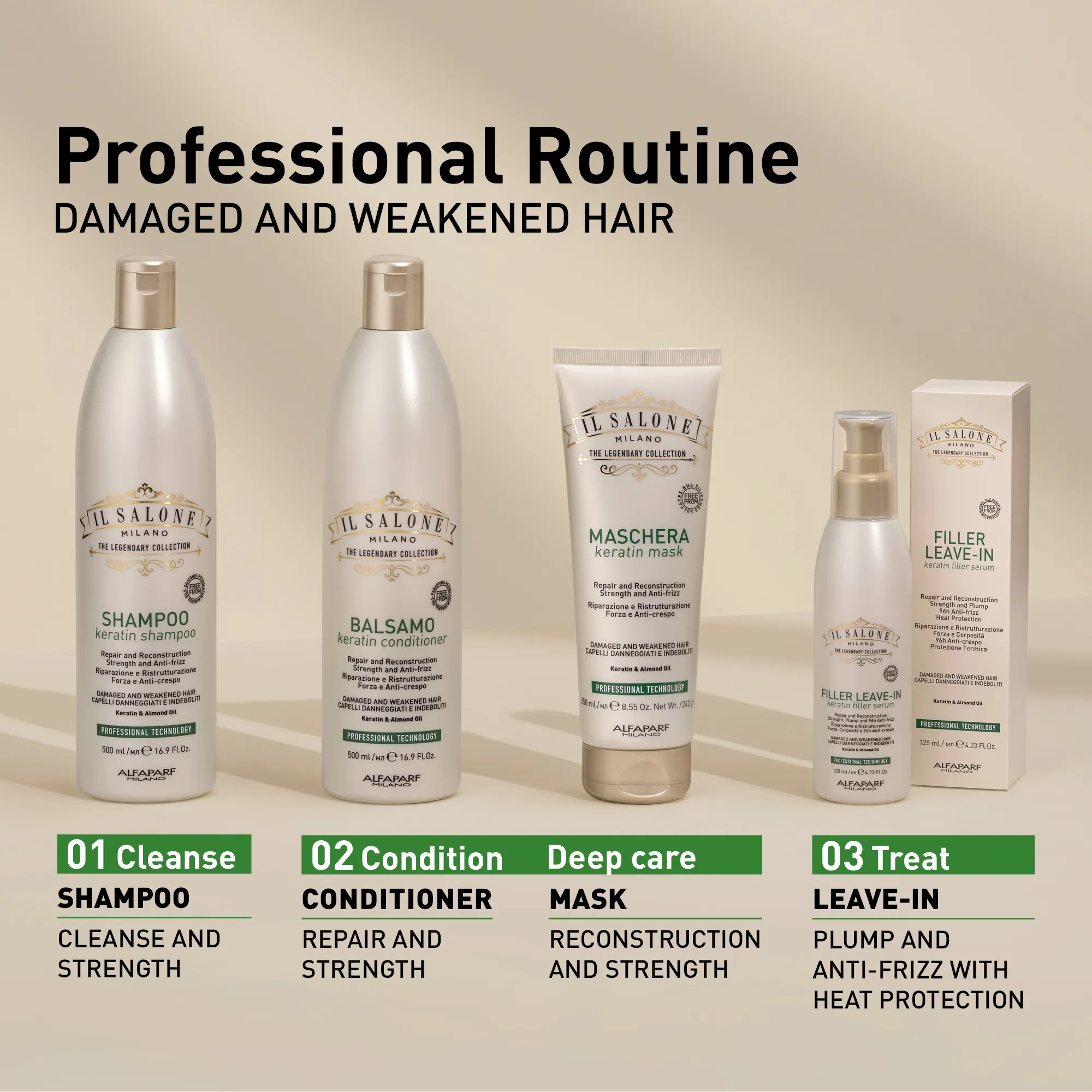 Professzionális szérum sérült és gyengült hajra. Helyreállító formula természetes eredetű összetevőkkel: Keratin, mandulaolajjal és amarantmag-kivonattal. Feltölti és megvastagítja a hajszálakat, erőt adva nekik. A haj már az első alkalmazás után háromszor erősebb*, és csökkenti a töredezett hajvégeket. A hajszálak felületét lezárja, így megvédi a hajat a páratartalomtól, és 4-szeres frizzgátló hatást biztosít, akár 96 órán át. Erős, teltebb és frizzmentes haj. Hővédelem 230 °C-ig (446 °F). Fodrászok által használt termék.