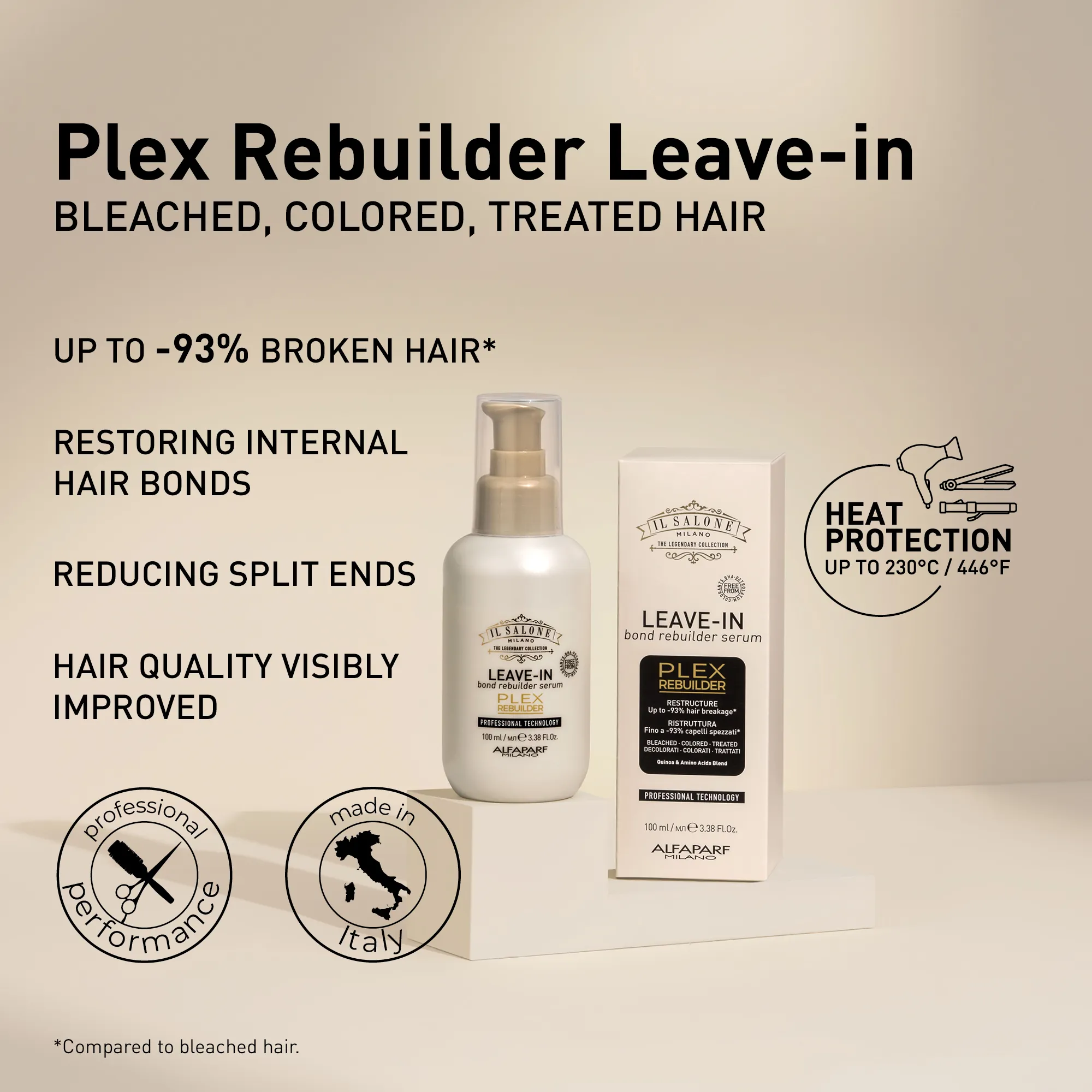 Professzionális szérum, amely megvédi a hajat a szőkítés, festés vagy kémiai kezelések okozta károsodásoktól. Plex Rebuilder helyreállítja a haj belső kötéseit, így visszaadva a haj belső erejét. Már az első alkalmazástól kezdve csökkenti a hajtörést, segít megvédeni a kötéseket és csökkenti a töredezett hajvégeket. Akár 93%-kal kevesebb törött haj*. Láthatóan jobb hajminőség. Élénkített és fegyelmezett haj. Hővédelem akár 230 °C-ig (446 °F). Fodrászok által használt termék.